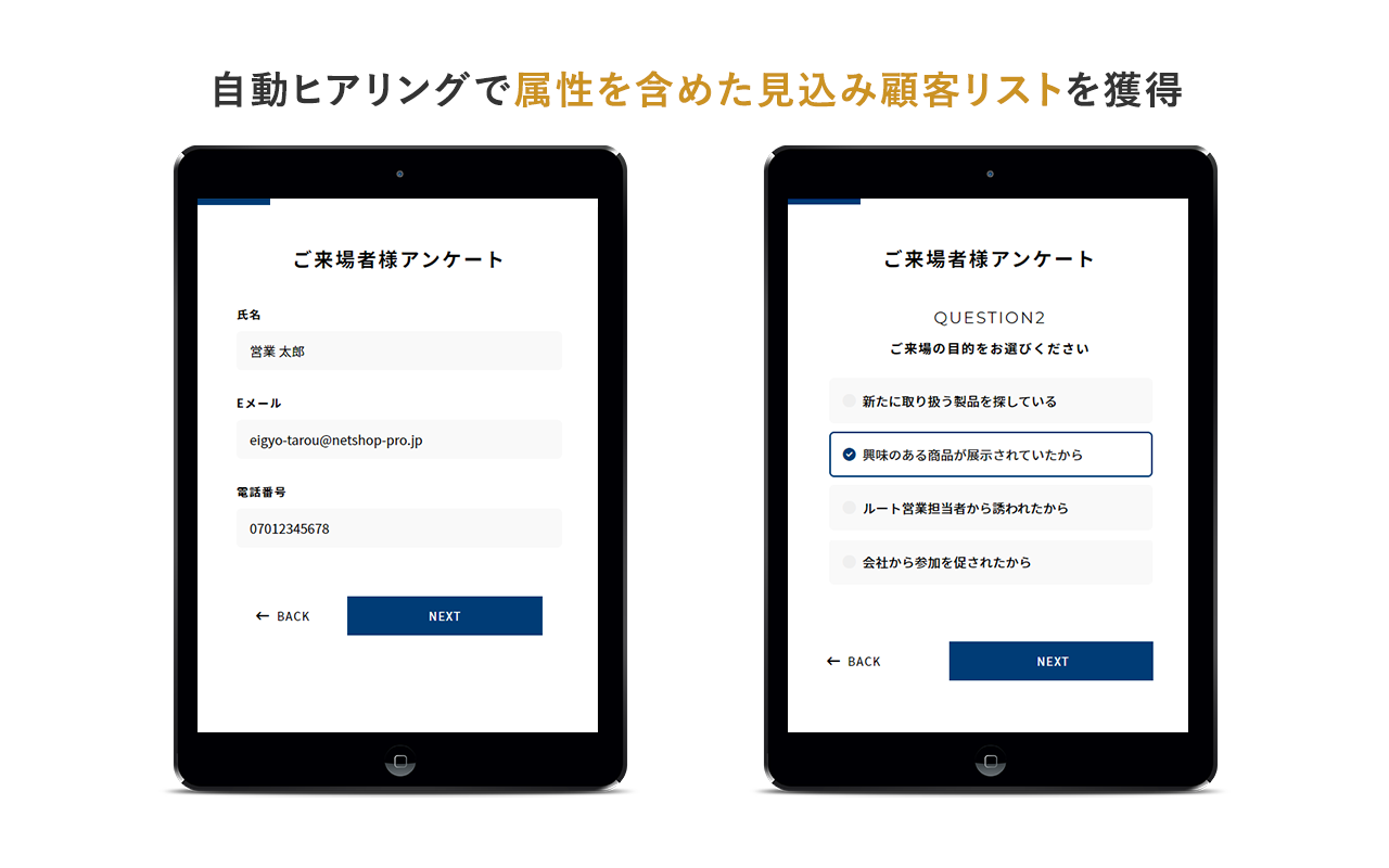 タブレットを用いて、ショールームや展示会・商談など幅広く、属性を含めた顧客情報の獲得にお使いいただけます。氏名やメールアドレス等の見込み顧客リストはCSV出力可能です。