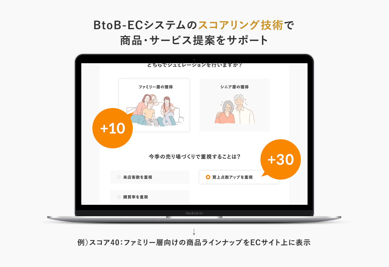 顧客にいくつかの質問を投げかけ、得た回答をもとにシステムが自動でスコアリング。最終的なスコアにより、企業の用途やニーズに合わせた商品やサービス提案がBtoB-ECサイト上で可能です。