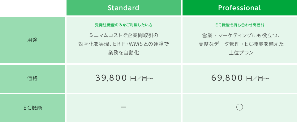 今回の改定により、受発注機能のみを利用できる「Standardプラン」と、1年間分まとめてお支払い頂くことで1ヶ月あたりの費用を抑えられる「年払いプラン」の提供を開始し、これまで以上にミニマムコストで運用スタートが可能になります。これにより、さらに多くの中小企業の受発注業務の効率化や売上のアップに貢献します。