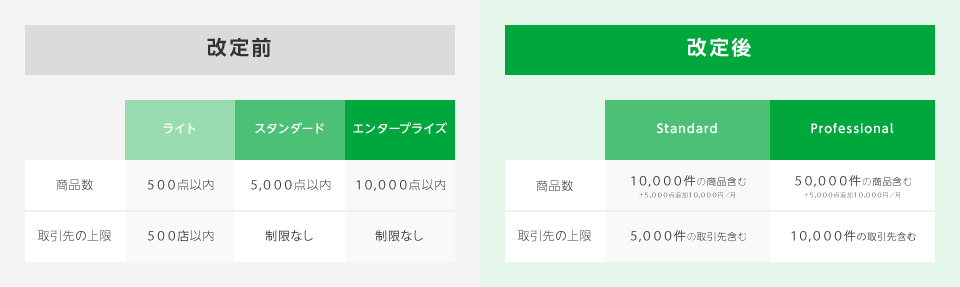 新料金プランは、各プランにおいて全機能をフルに利用でき、プランをアップグレードすることなく商品や取引先の追加が可能になります。