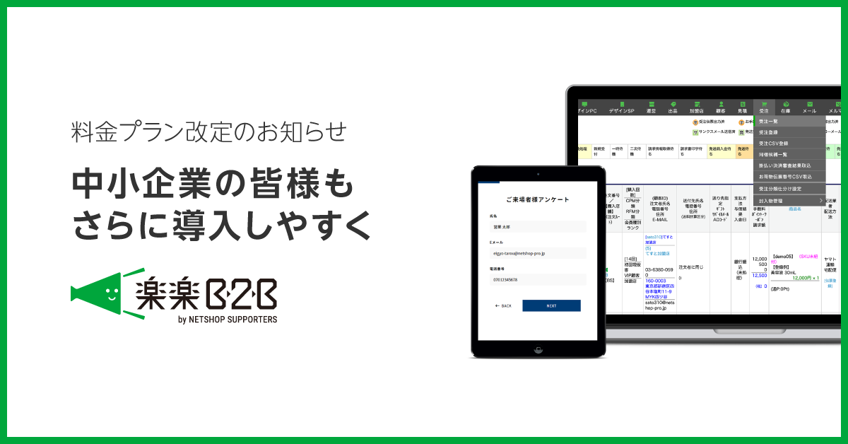 株式会社ネットショップ支援室は、法人向けBtoB-ECカートシステム『楽楽B2B』において、2023年12月1日より料金プランを改定することをお知らせいたします。