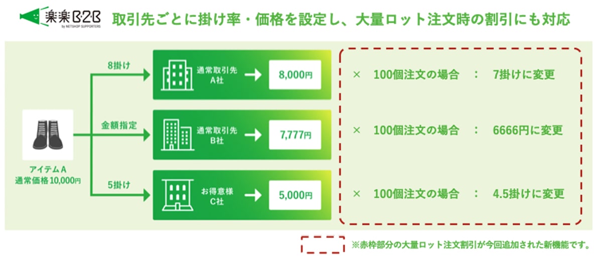 株式会社ネットショップ支援室(本社:東京都新宿区、代表取締役:泉 成人)は、企業間の取引(BtoB受発注)の電子化/自動化をすすめるためのクラウドツール「楽楽B2B®」を提供しておりますが、この度かねてよりご要望の多かった「大量ロット注文時の割引卸価格設定」に対応したことをお知らせ致します。
