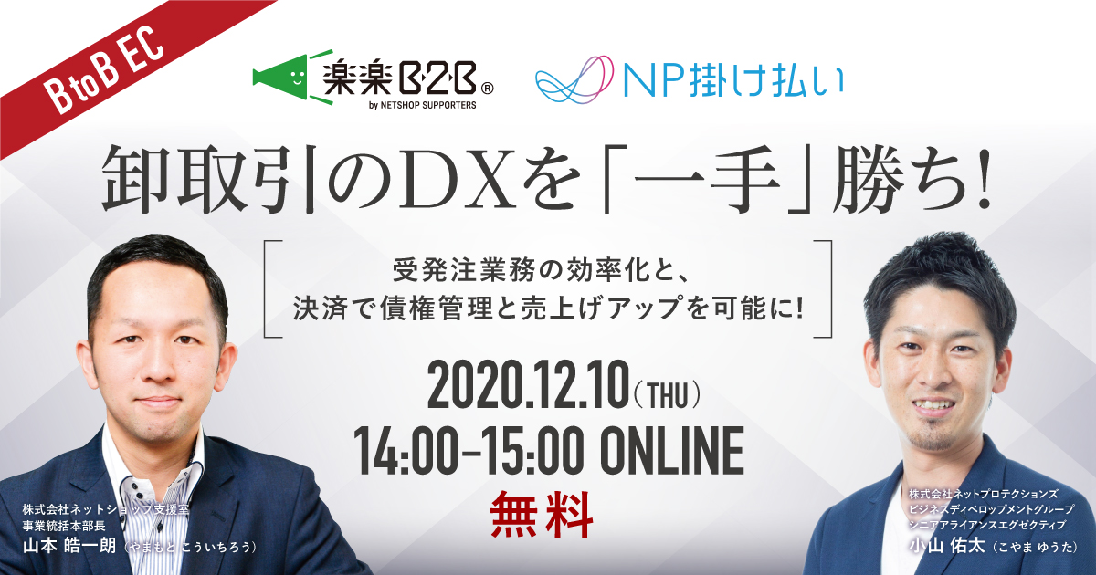 本セミナーでは、卸取引のデジタルトランスフォーメーションを先取りできる、従来のアナログな卸取引の「仕組み」を変えるための方法論「BtoB EC」の始め方と活用方法について解説します。「BtoB EC」の導入で、従来の卸取引の業務と比較して大幅な人的コスト削減と、売上向上をもたらすことができる希望の仕組みが実現します。さらに、リスク保証型の請求代行サービス「NP掛け払い」がもたらす決済領域の革新的なメリットで債権管理も売上UPも同時に目指す方法をご教示致します!