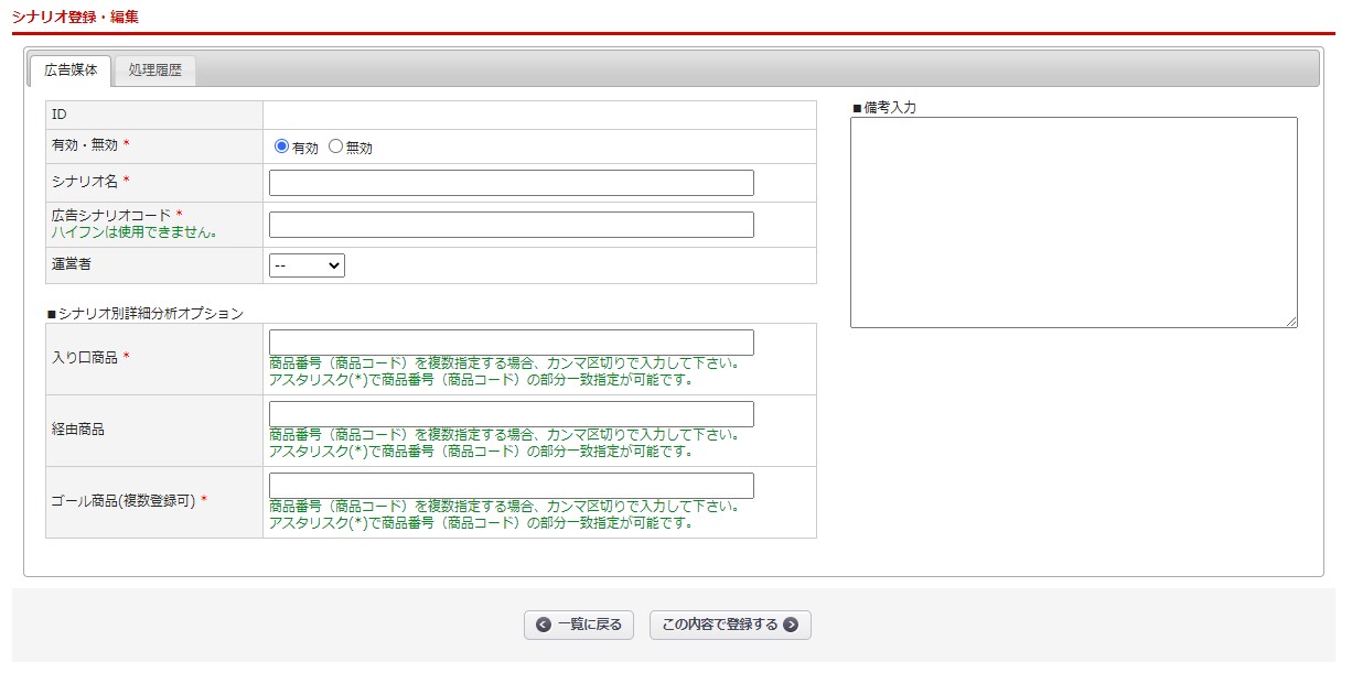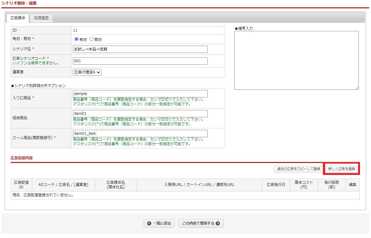広告分析>広告シナリオ登録