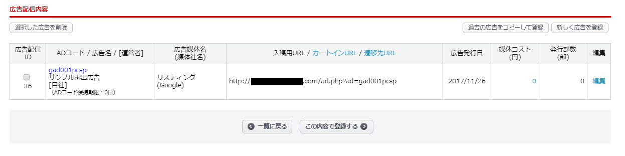 広告の登録へは、【一覧に戻る】ボタンをクリックし、一覧へ移動して下さい。
