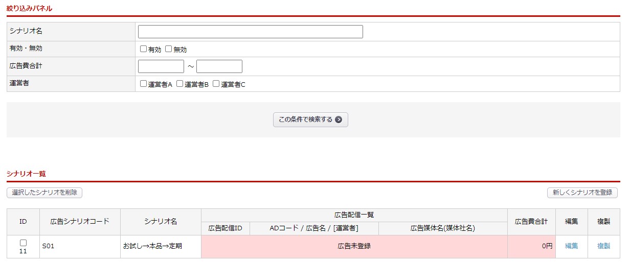 | 運営者 | システム設定>マスター管理 にて登録済みの運営者値です。 運営者を登録しておくと、ログインユーザーに紐付く運営者の登録データのみ表示されます。 ・シナリオ別分析画面 ・広告登録画面 ・広告シナリオ登録画面 また、上記登録データのみの分析結果が表示されます。 【関連】広告運営会社に権限を設定した状態のアカウントを発行したい |