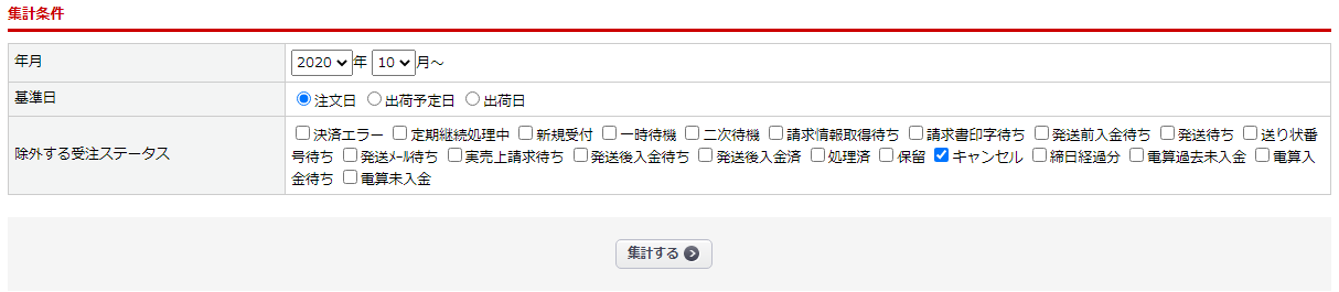 基準日注文日、出荷予定日、出荷日のいずれかを基準日として選択してください。