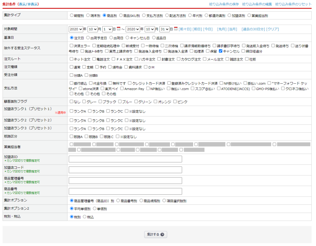 集計オプション 商品別・規格別・選択肢別を指定します。