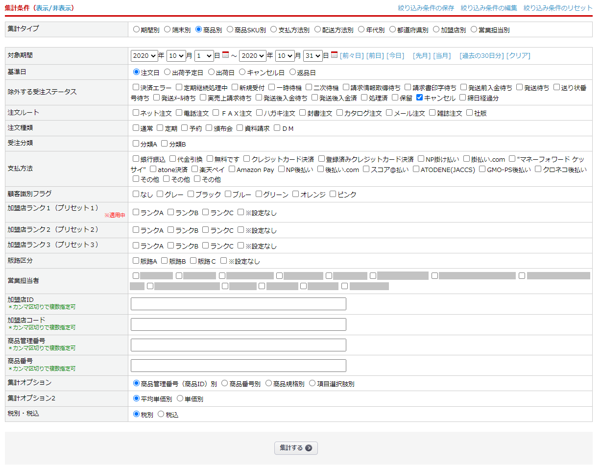 集計オプション 商品別・規格別・選択肢別を指定します。
