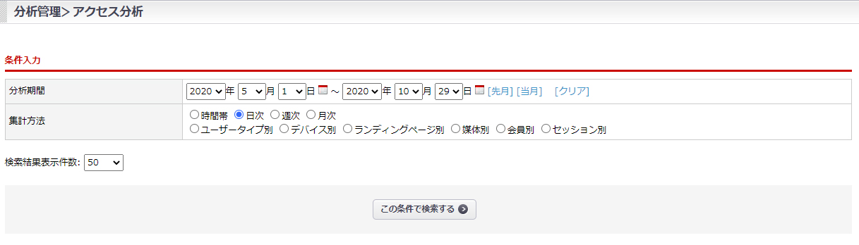 「条件入力」にて、分析期間、集計方法を選択し、【この条件で検索する】をクリック