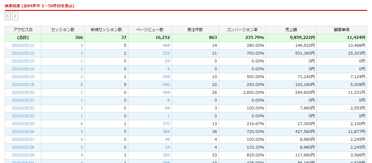 1セッションの期間が日付をまたいだ場合、その間の セッション数、ページビュー数、受注件数、売上額、は初回セッション時にカウントされます。