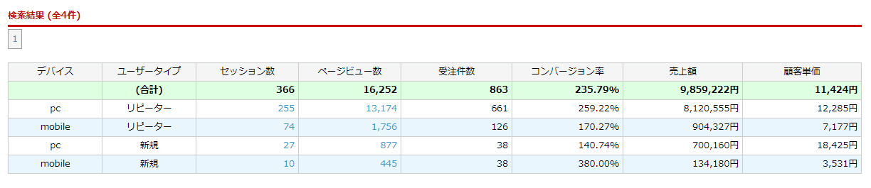 対象の集計方法:時間帯、日次、週次、月次、ユーザータイプ別、デバイス別、会員別
