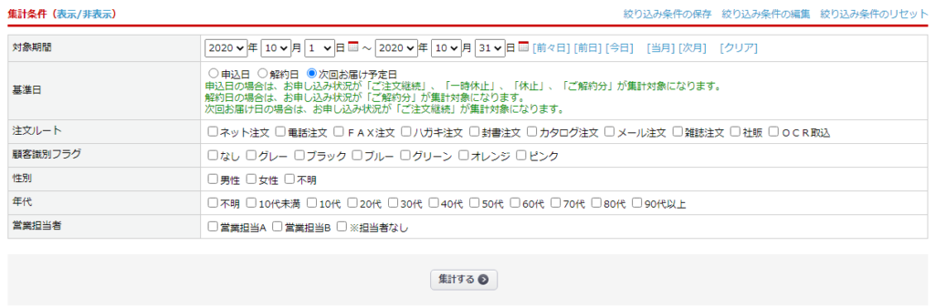 | 基準日 | 申込日、解約日、次回お届け予定日、から基準とする日を設定 申込日の場合は、お申し込み状況が「ご注文継続」、「一時休止」、「休止」、「ご解約分」が集計対象になります。 解約日の場合は、お申し込み状況が「ご解約分」が集計対象になります。 次回お届け日の場合は、お申し込み状況が「ご注文継続」が集計対象になります。 |
