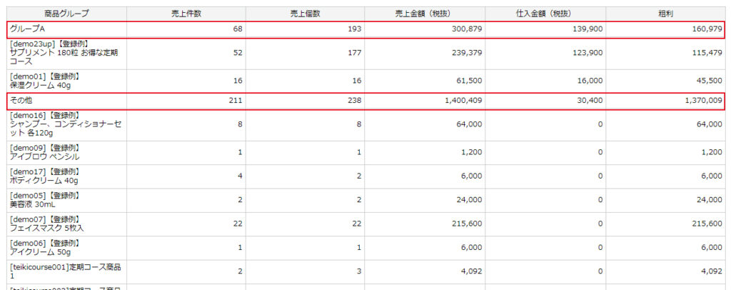 ※グループの合計が表示され(赤枠の行)、その下に内訳の商品別集計結果が表示されます。