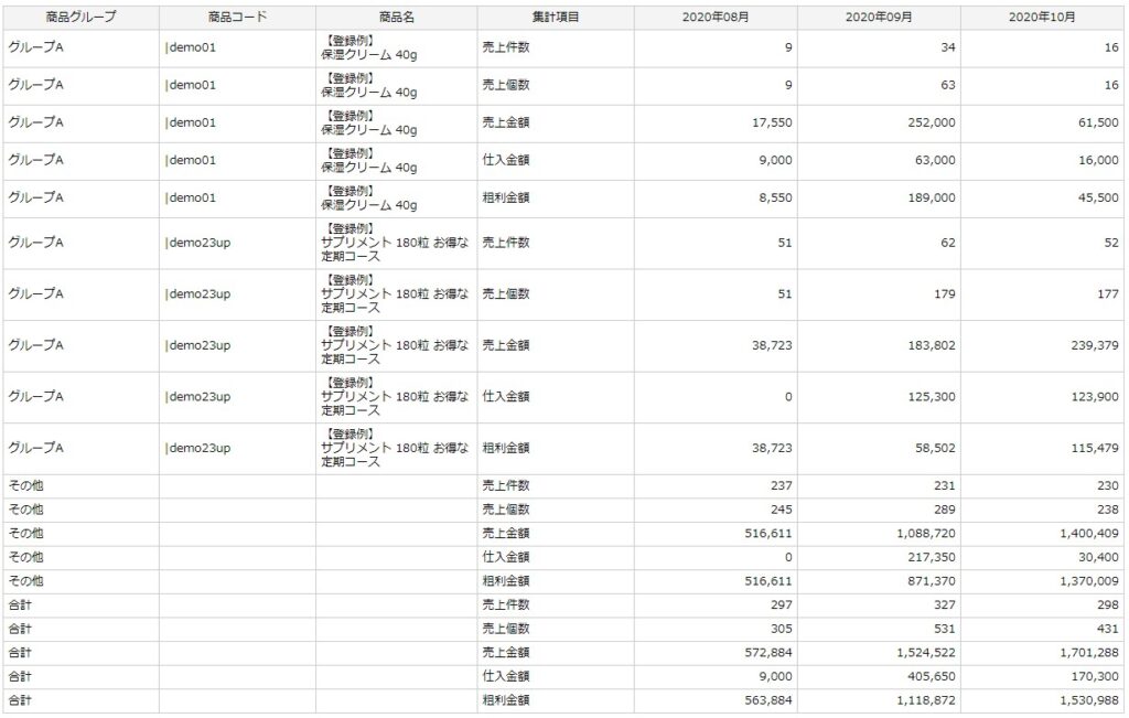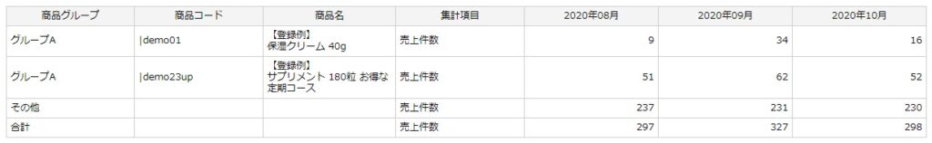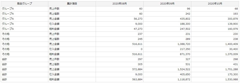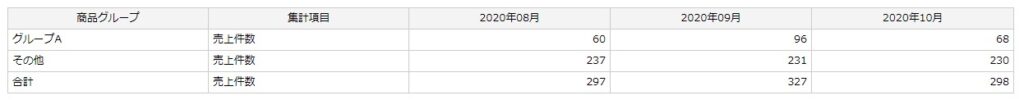 グループ指定した商品と、それ以外の商品という形で集計が表示されます。