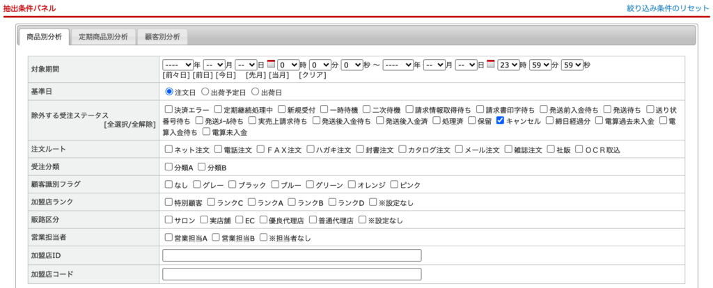| 基準日 | 集計対象期間の基準とする日を設定 注文日:注文日が集計対象期間内の受注データを対象として集計します 出荷予定日:出荷予定日が集計対象期間内の受注データを対象として集計を行います 出荷日:出荷日が集計対象期間内の受注データを対象として集計を行います |