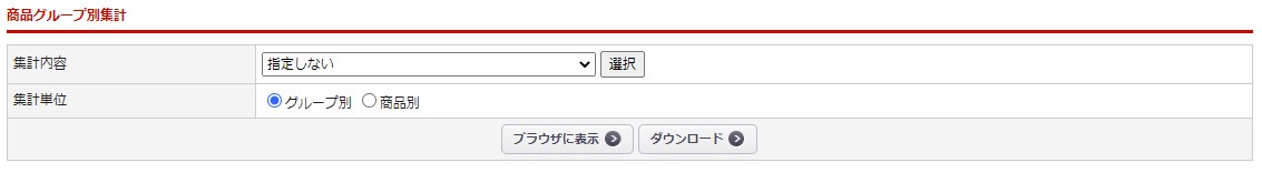 | 集計内容 | グループをプルダウンから選択、もしくは【選択】ボタンをクリックすると商品グループを検索でき、「決定」をクリックして選択します。 |
