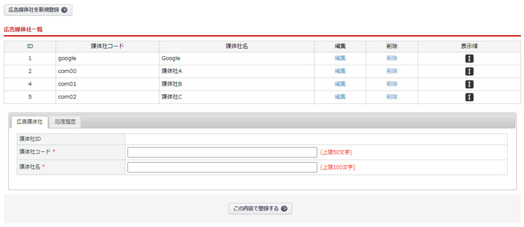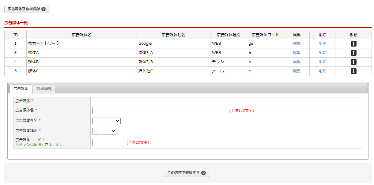 広告媒体名/広告媒体社名/広告媒体種別/広告媒体コードをそれぞれ入力・選択し、この内容で登録するをクリックします。