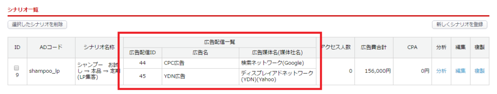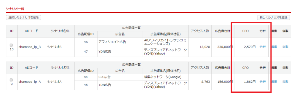 シナリオごとのCPAがひと目で分かります。さらに分析画面にて詳細情報が確認可能です。