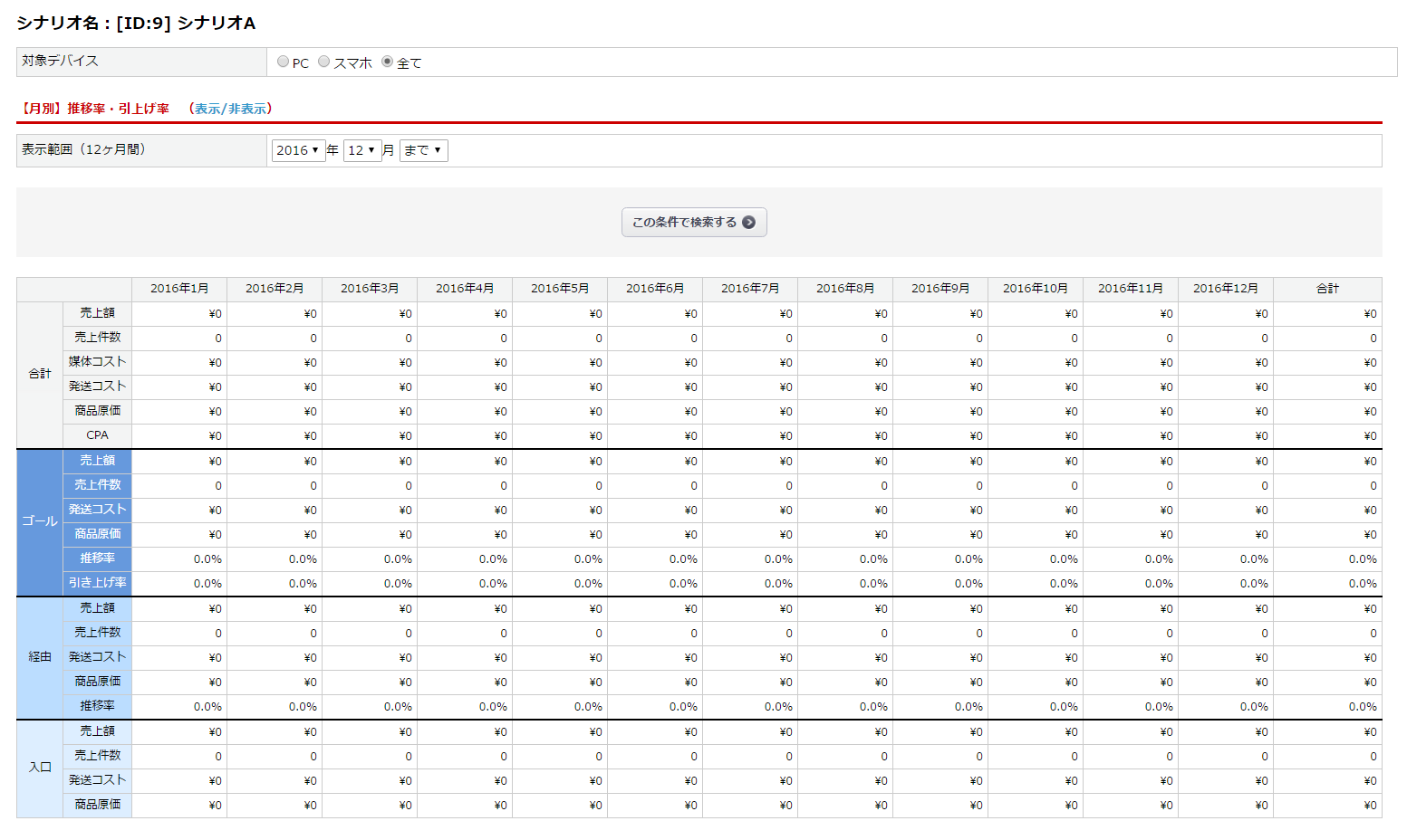 分析結果画面にて、広告毎のCVR、CPOだけでなく、シナリオ全体の月別実績が確認できます。