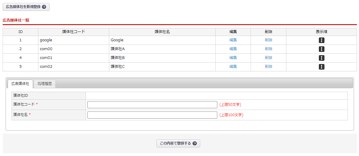 | 編集 | 登録済の媒体登録情報を編集可能です |