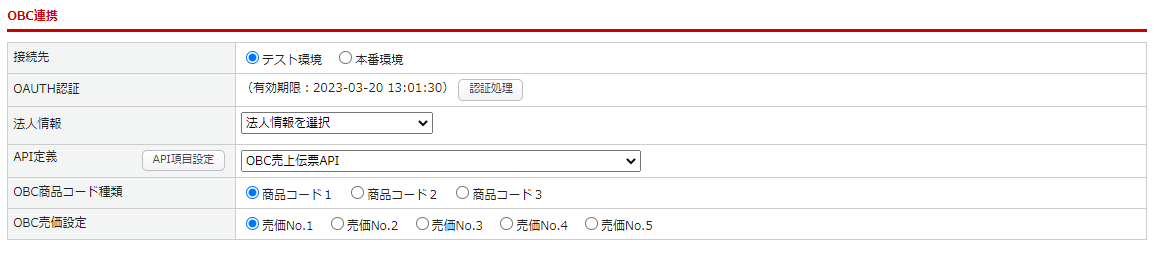 OAUTH認証後、法人情報、API定義、OBC商品コード種類やOBC売価設定を設定してください。