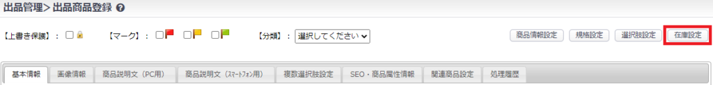 出品商品登録画面右上の【在庫設定】ボタンをクリックして、在庫(商品規格)登録画面を開きます。