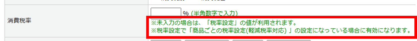 | 表記内容の補足 | 購入フローの軽減税率対象商品に表示する注記の補足を設定します。 |