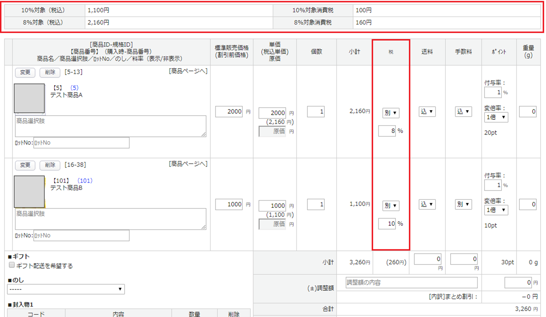 | 8%(軽減税率の対象商品)のみ | ・消費税率:8 ・送料消費税率:10 ・手数料料消費税率:10 |