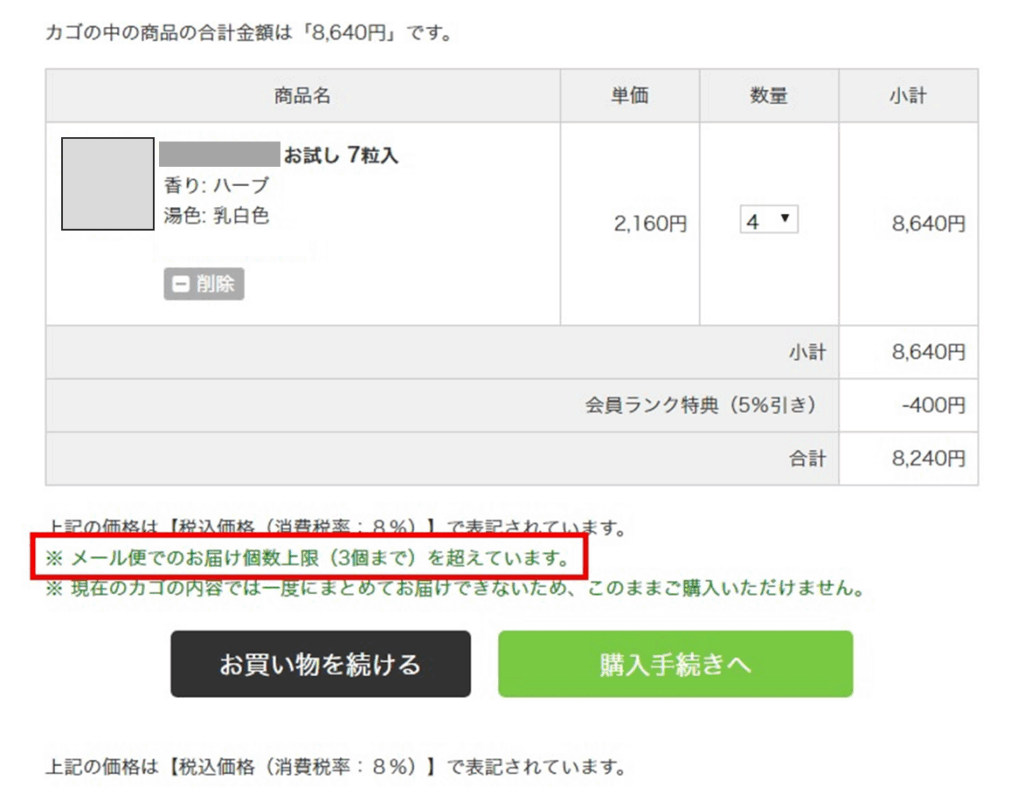 商品数が3個以上(同商品/別商品問わず)の場合以下のエラーメッセージが表示され購入不可となります。