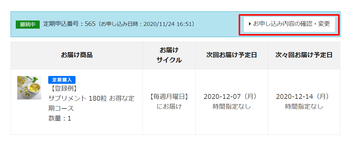 MYページの定期購入お申込み詳細の表示例
