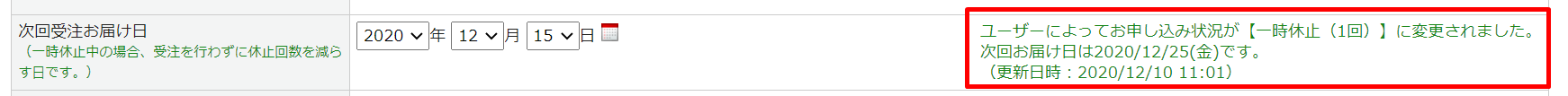 「継続状況」「お届けサイクル」を変更した際、管理画面上の次回受注お届け日の右側に