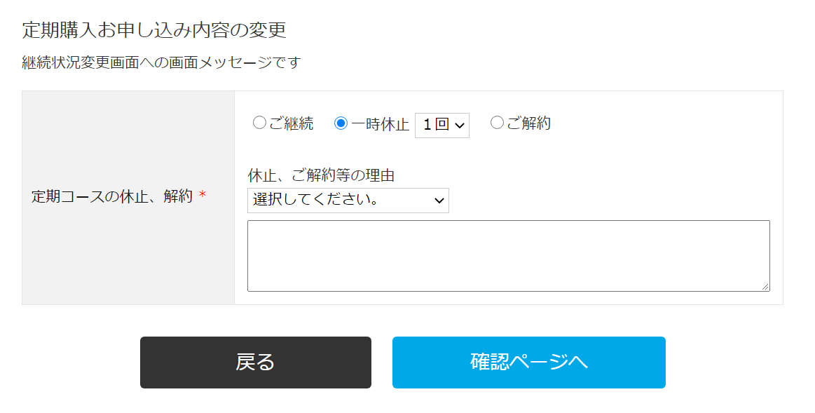 「一時休止のみ許可する」を選択すると、MYページにて定期購入商品の「一時休止」を選択することができます。