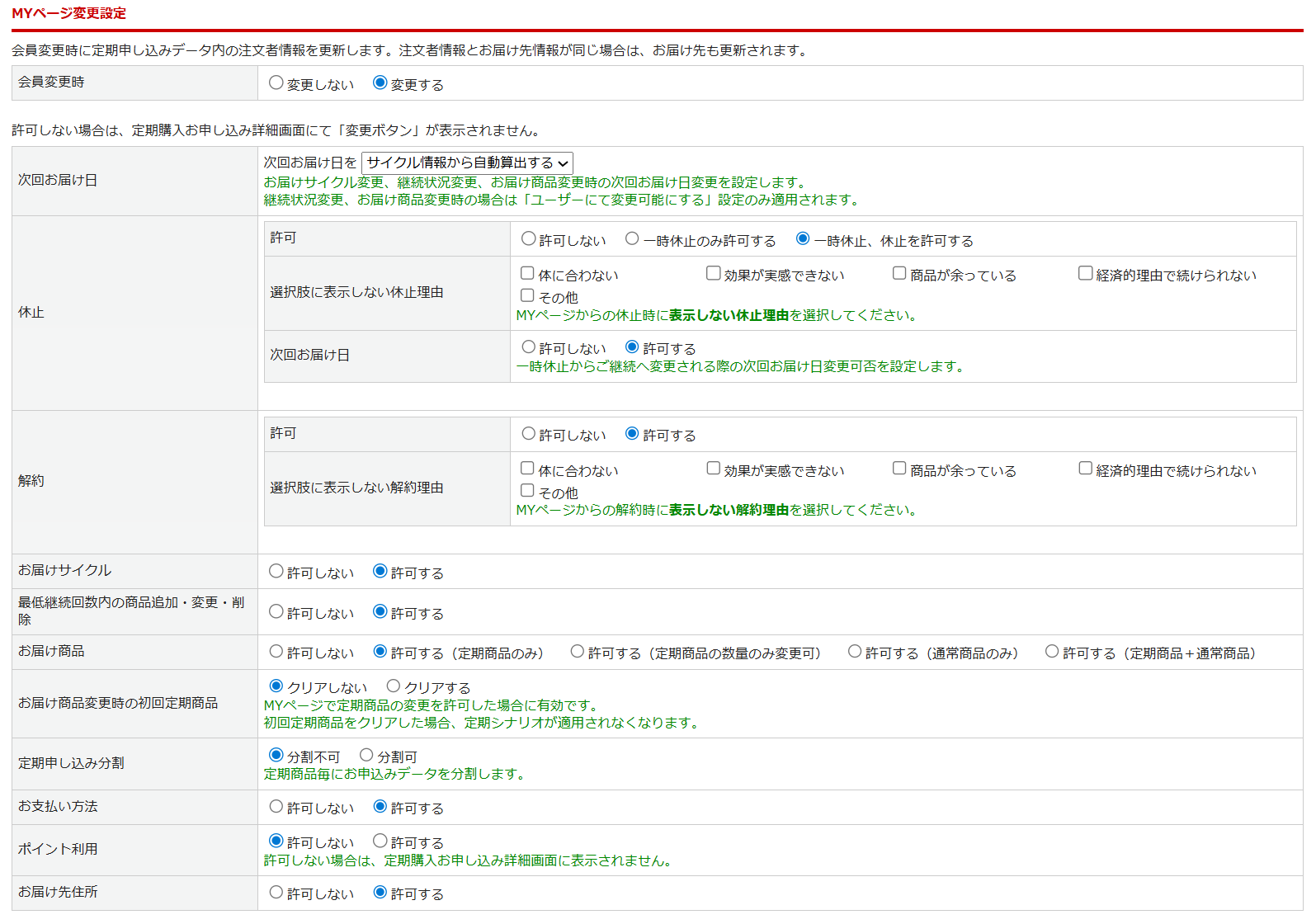 ※MYページからの「休止」の選択を許可する場合は、MYページ変更設定の項目「一時休止」で「許可する」を選択してください。