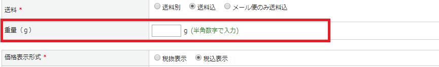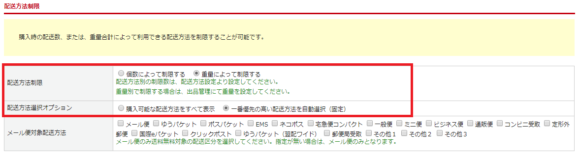 配送重量上限が「5」の場合、「5g」までの設定をしてある配送方法は選択が可能。