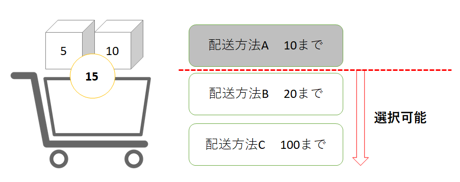 配送重量上限を「配送方法A:10g/配送方法B:20g/配送方法C:100g」で設定していた場合