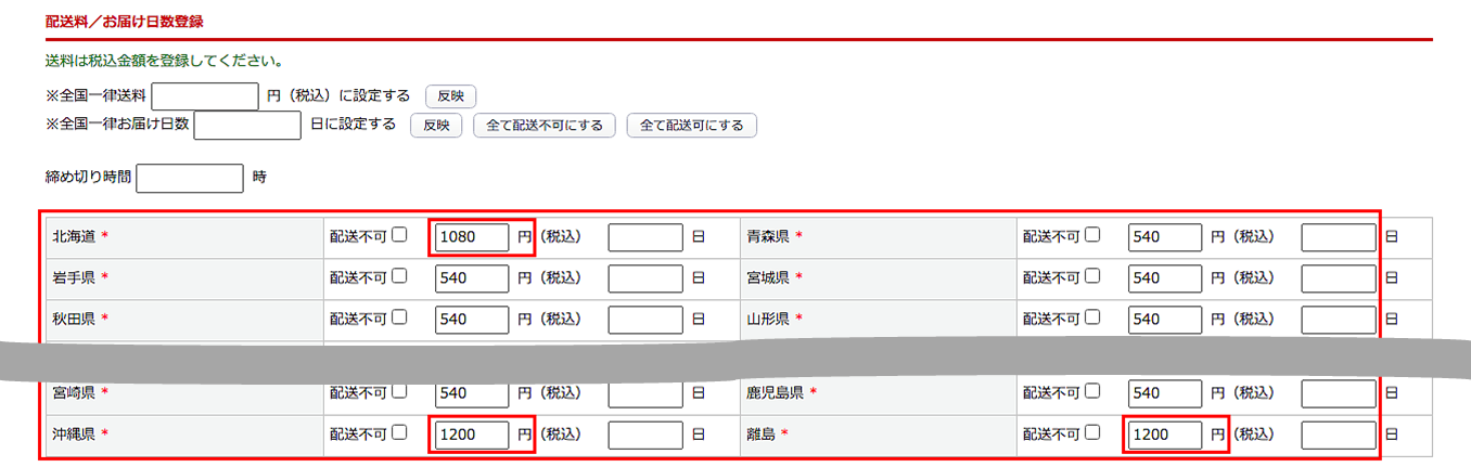 以下画像のように、該当する都道府県の送料のみ変更してください。
