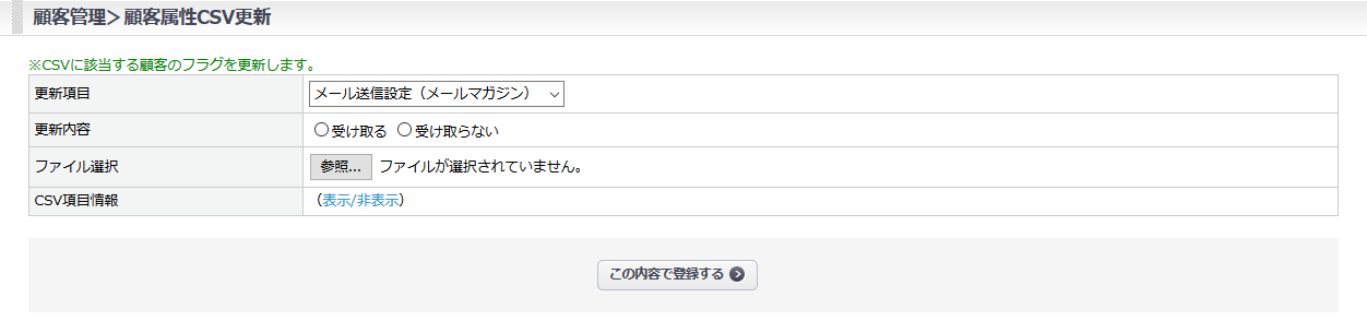 - ファイル選択:対象の顧客ID、またはメールアドレスを記載したCSVファイルを選択します