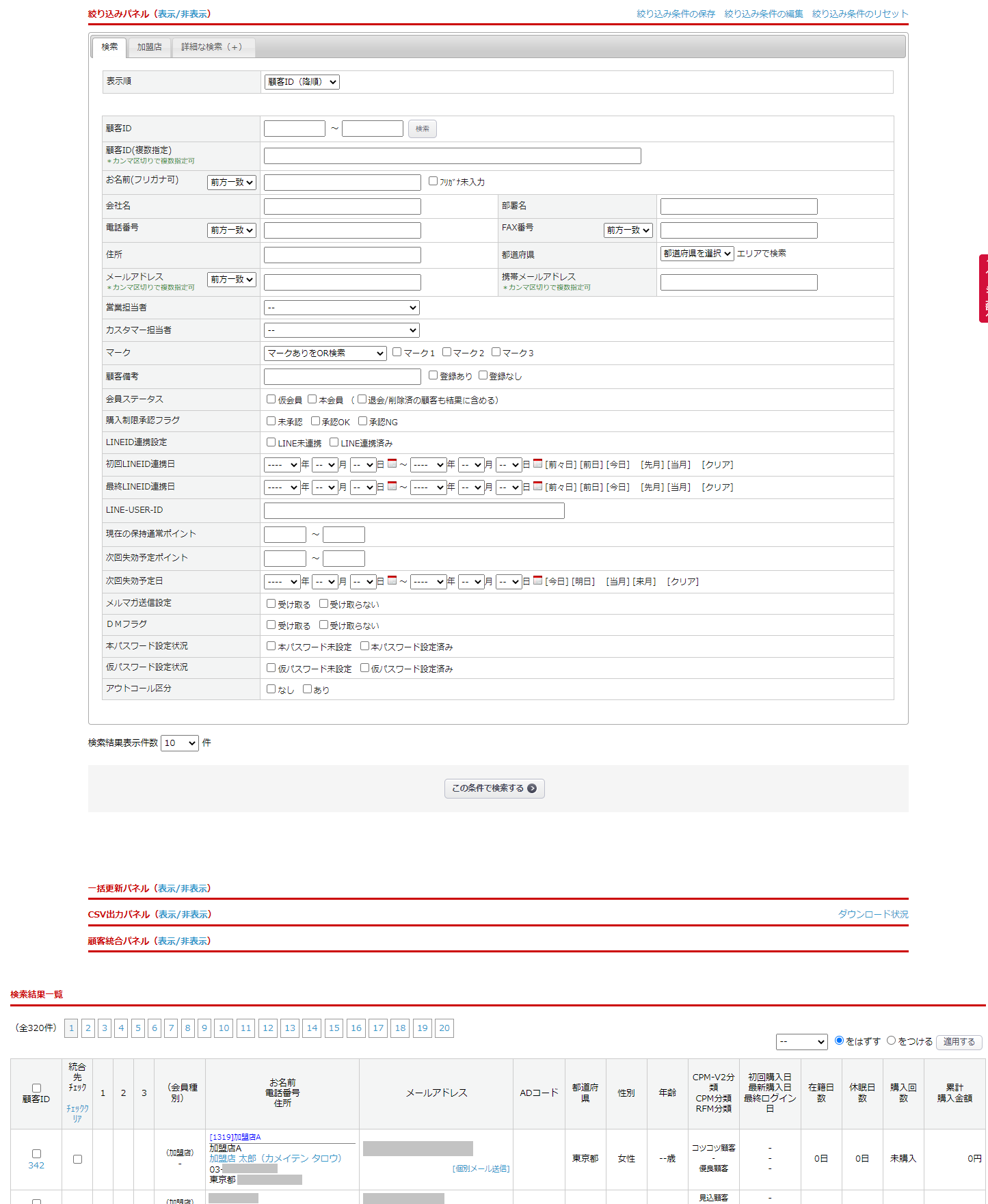 会員情報を一覧で確認できます。IDまたは名前をクリックすると顧客登録画面が開き、詳細な情報の確認、顧客情報の修正が可能です。