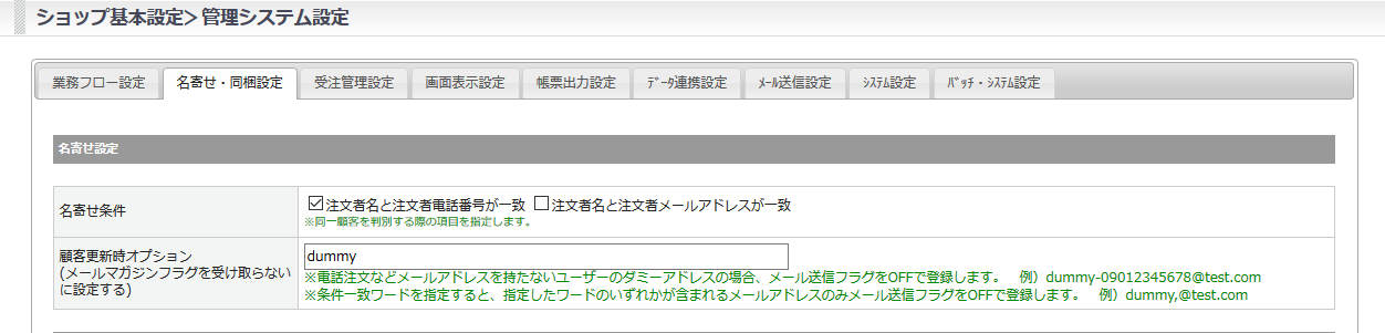 基本設定>管理システム設定>[名寄せ・同梱設定]タブ>顧客更新時オプションに設定された文字列がメールアドレスに含まれる場合、強制的に[受け取らない]で登録されます。