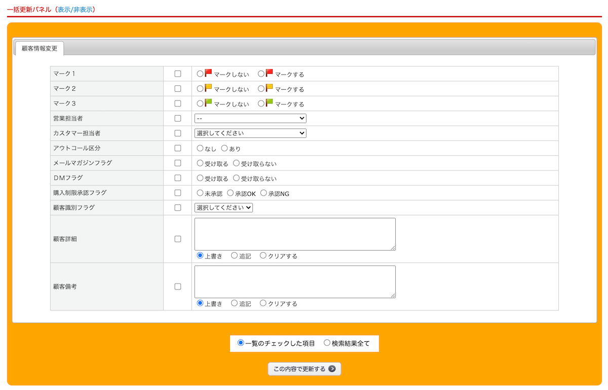 更新対象となる顧客データの範囲は「一覧のチェックした項目」または「検索結果全て」より選択してください。