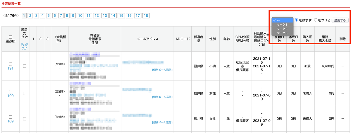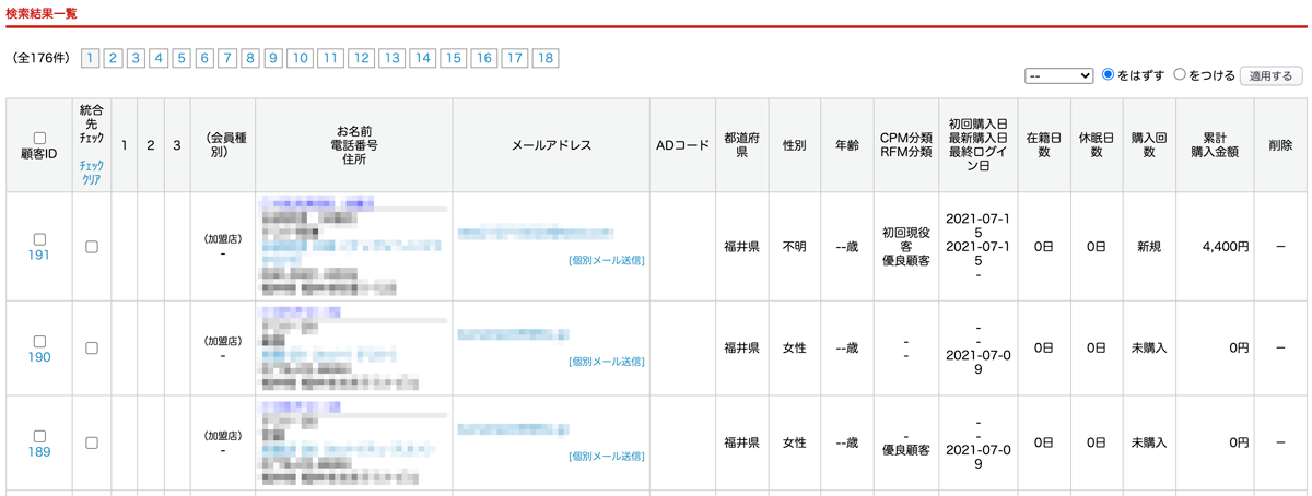 また、顧客データの一括更新、CSV出力、個別メール送信が可能です。