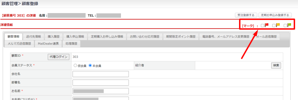 顧客 > 顧客登録 画面右上にて、顧客別に内部管理用のマークを任意で設定できます。※複数設定可