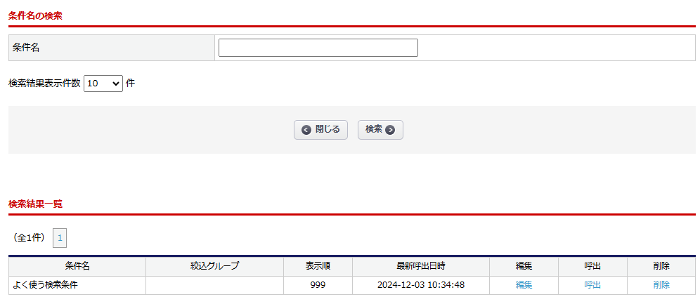 条件を設定しこの条件で検索するをクリックすると、下部の「検索結果一覧」に結果が表示されます。