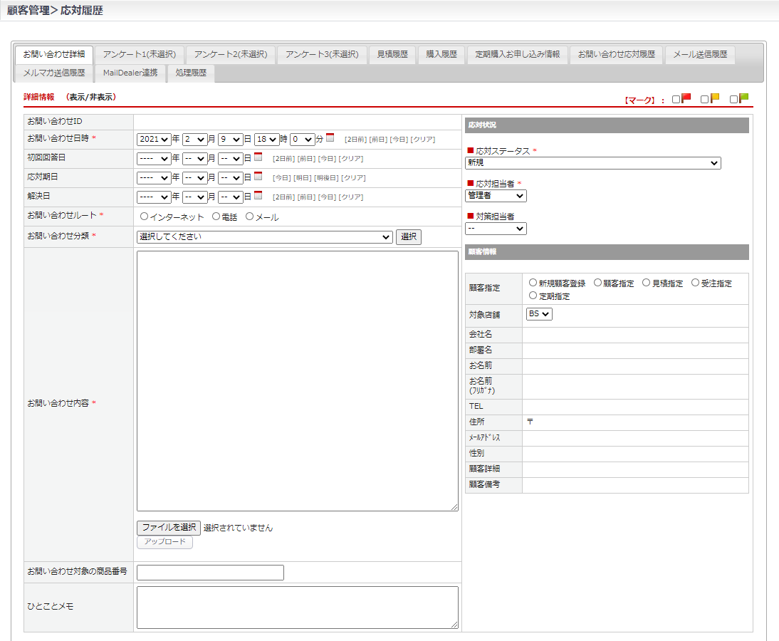 顧客>応対履歴>「お問い合わせ詳細」タブ