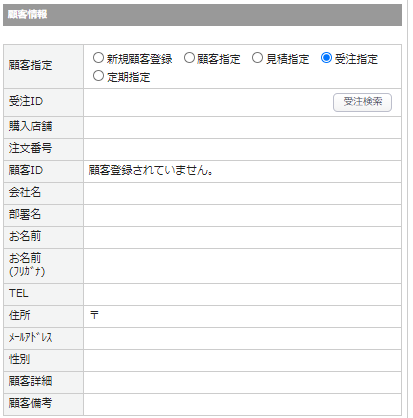 【受注検索】ボタンより受注検索画面にて、受注ID/注文番号から顧客を選択してください。