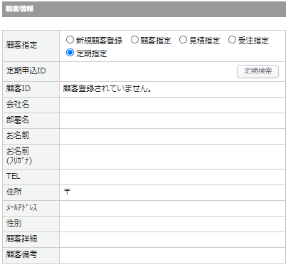 【定期検索】ボタンより定期申込検索画面にて、定期申込ID/定期申込番号から顧客を選択してください。