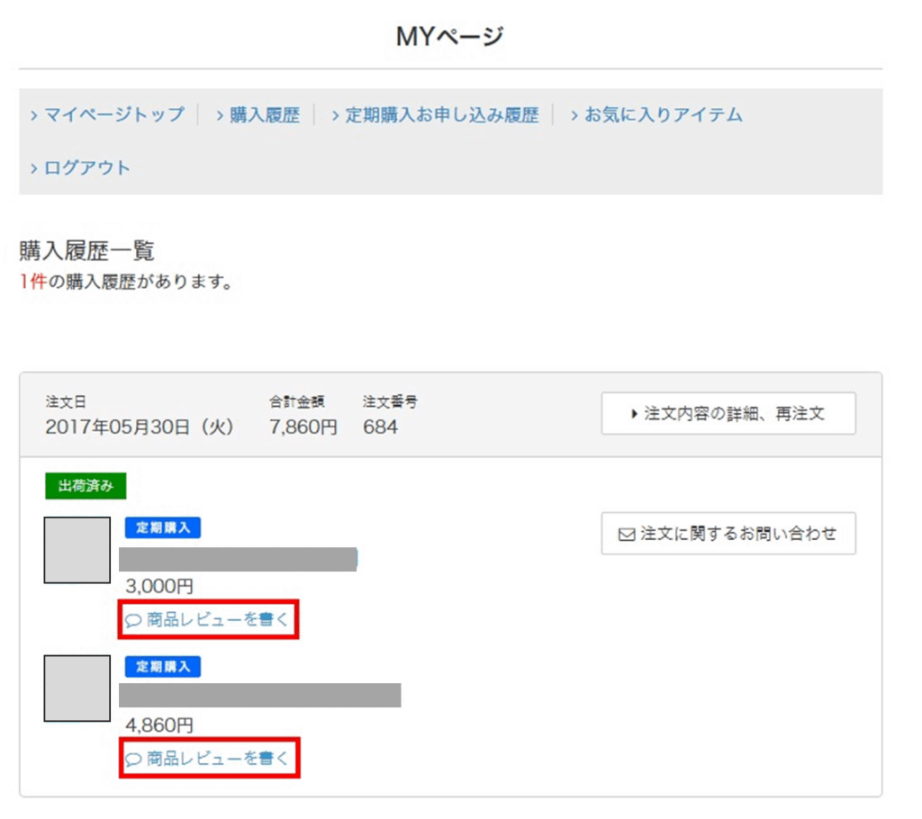 MYページ>購入履歴に表示される「商品レビューを書く」のリンク先より投稿可能です。