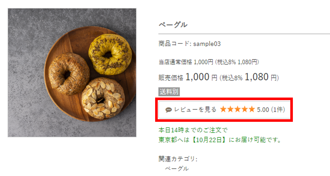 レビューがある場合、商品詳細部分に、総合点数・書き込み件数が表示されます。