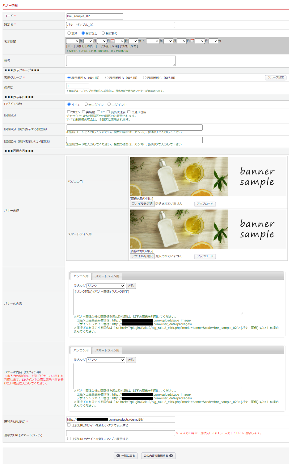 | 販路区分 | バナーの表示条件として、販路区分での指定が可能です。 表示する販路にチェックを入れてください。 全て未選択の場合は販路区分は考慮せず表示されます。 |